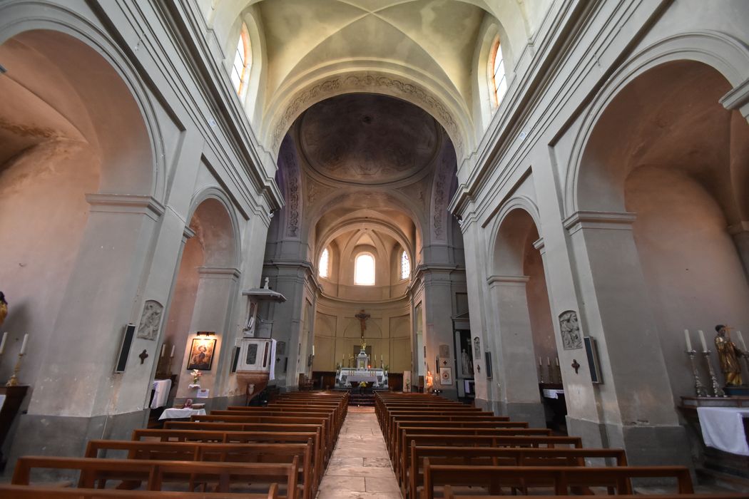 La nef est bordée de huit chapelles sur les côtés et se termine par un chœur plat, qui est encadré d'un côté par une chapelle consacrée à la Vierge Marie et de l'autre par une sacristie. Elle est rectangulaire et précédée d'une galonnière en façade. L'église est dédiée à la bienheureuse Vierge Marie.